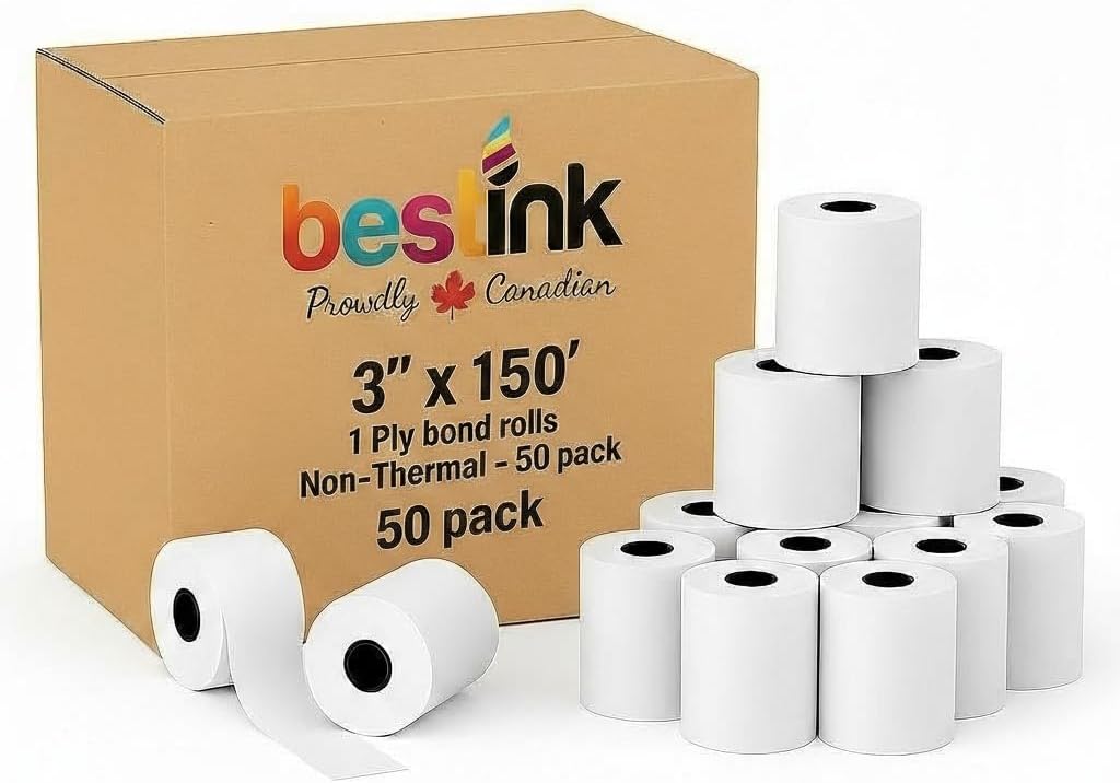 3" x 150' 1-Ply Bond (Non-Thermal) Paper Rolls – 50 Pack | Compatible with SP700, TMU200, NCR 2174 & More | Requires ERC30/34/38 Ribbons | Premium POS Kitchen Receipt Paper